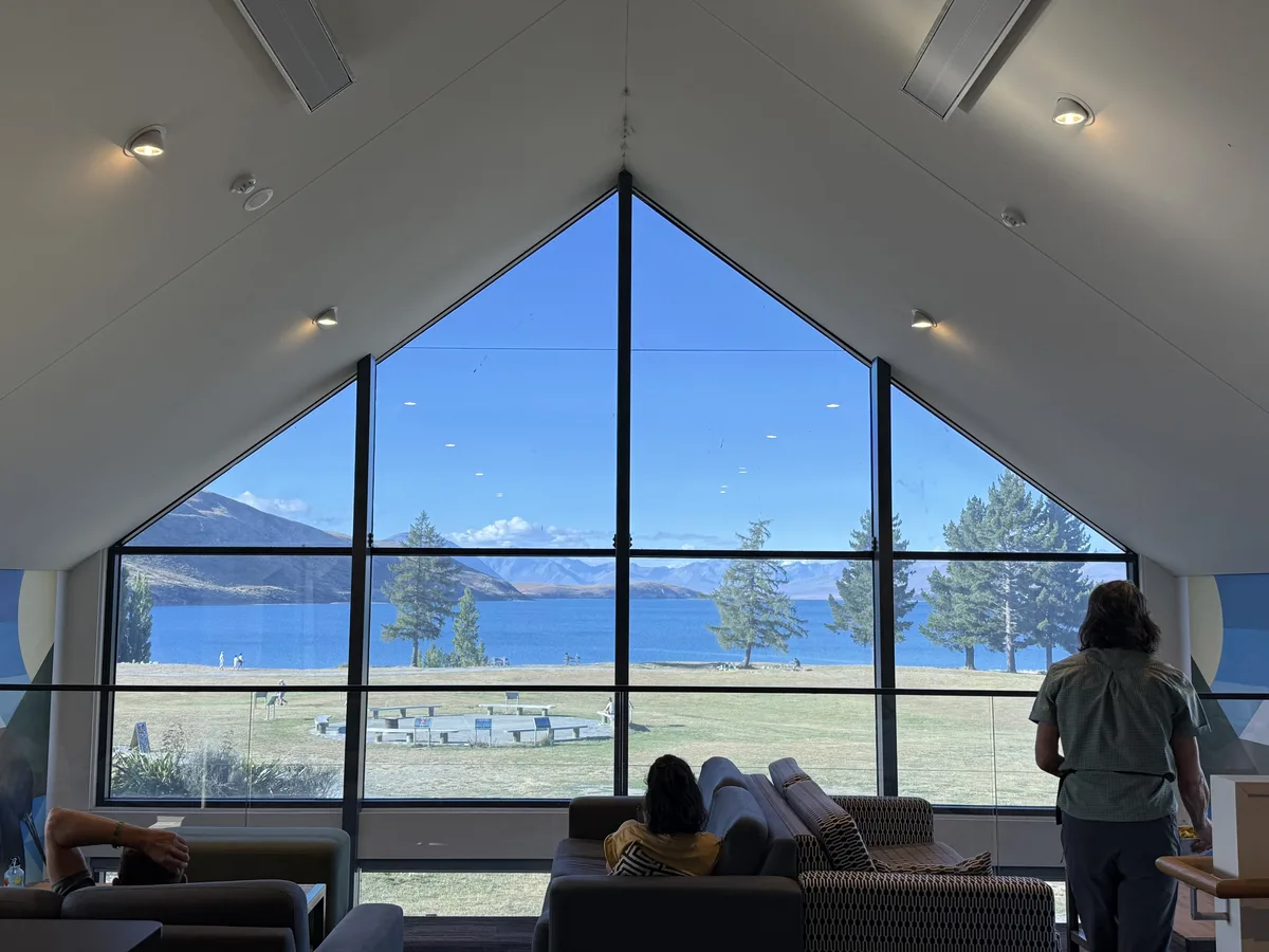 숙소 문을 나서자마자 마주치는 풍경입니다. 테카포 호수의 에메랄드빛 물색이 눈앞에 펼쳐지는데, 처음 이 뷰를 봤을 때의 감동은 아직도 잊히지 않습니다. 위치 하나만으로도 이 숙소를 선택할 충분한 이유가 됩니다.